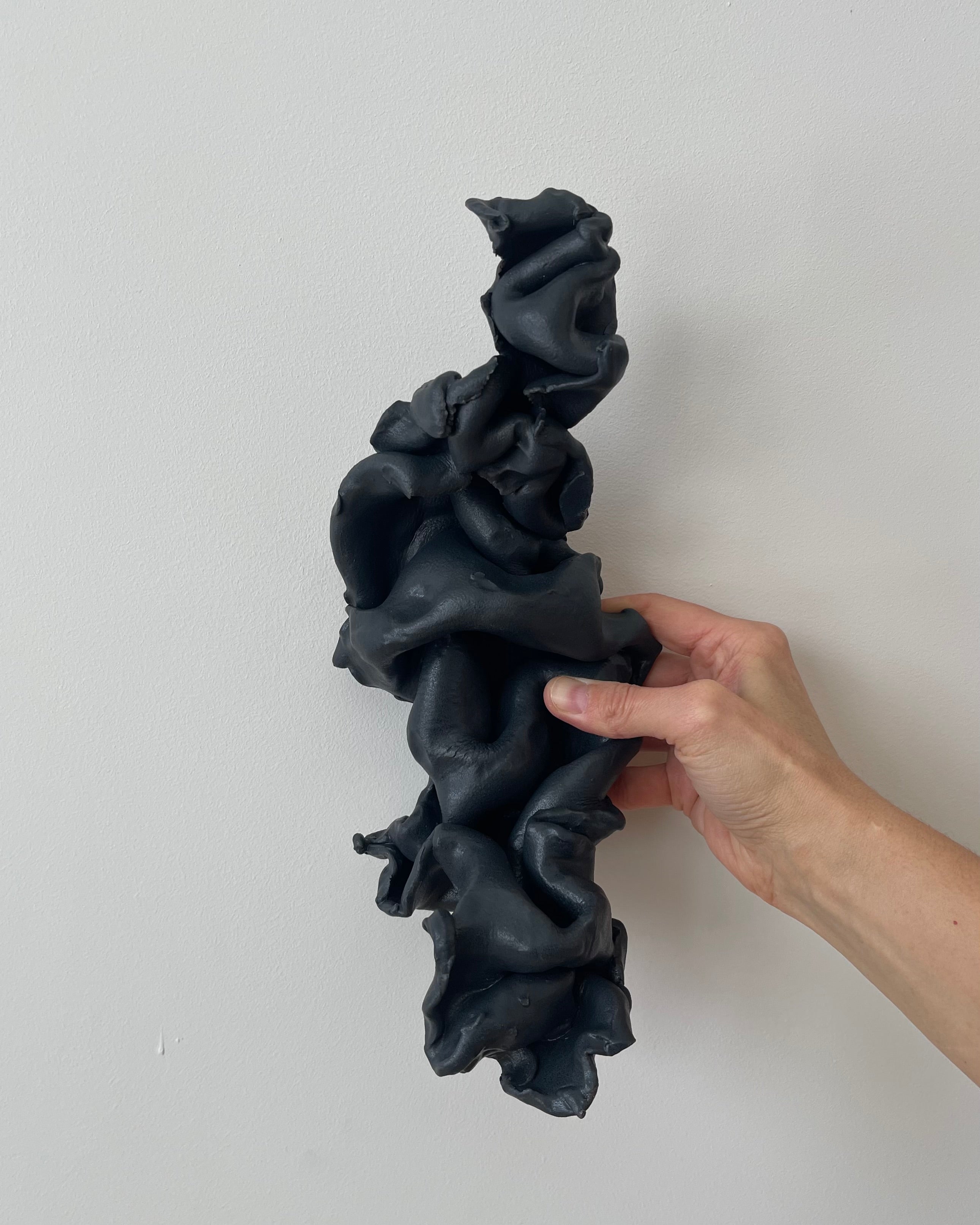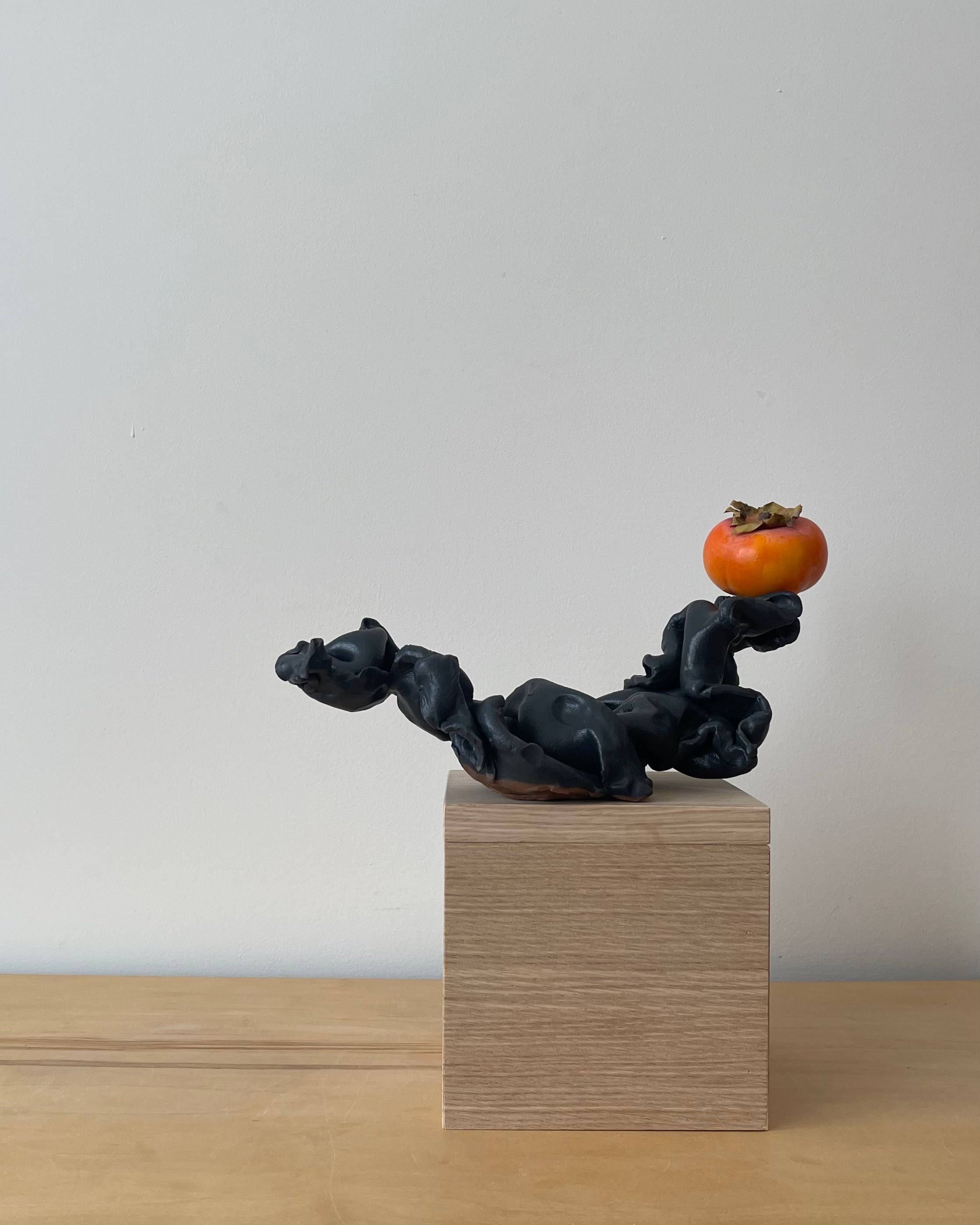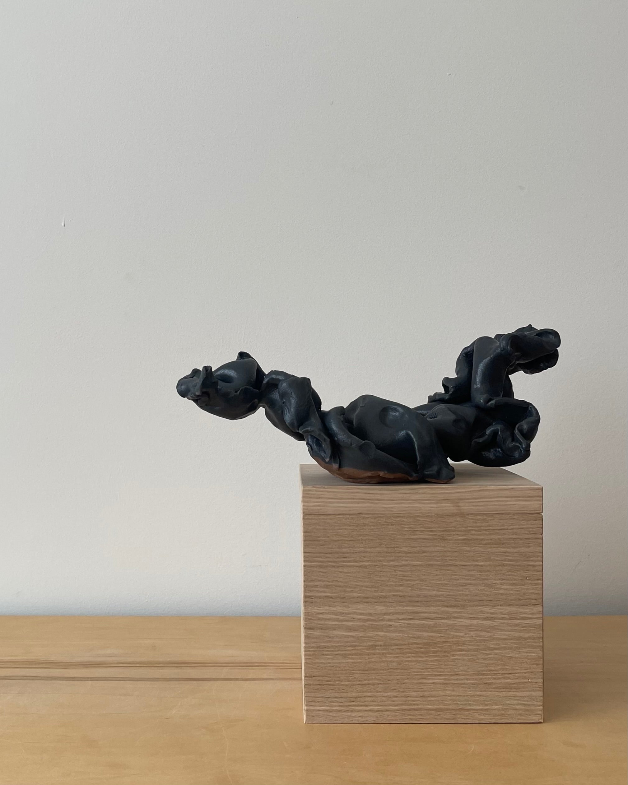 One of a kind, sculptural decor. Brown stoneware finished with matte black glaze.