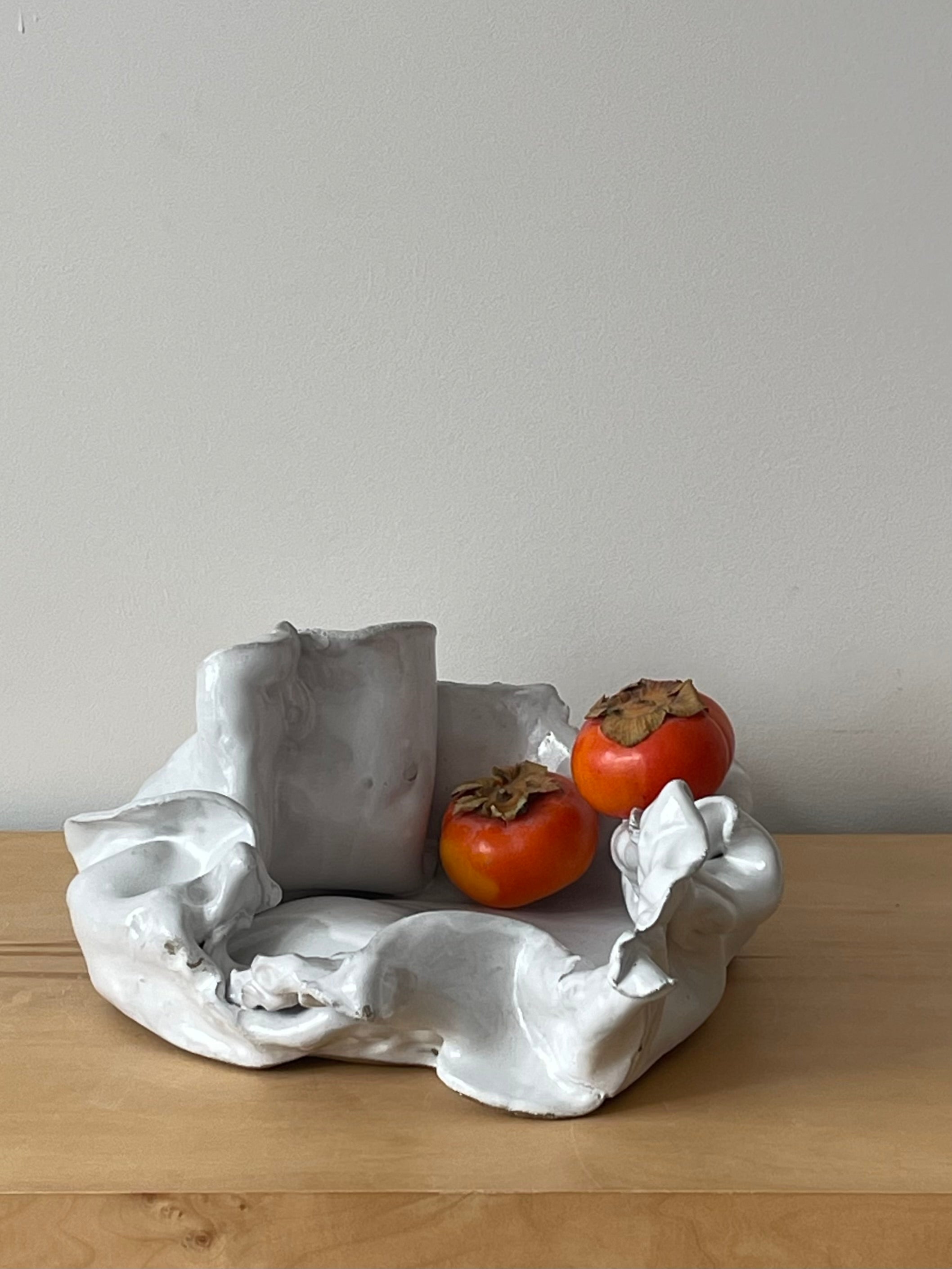 Large, sculptural bowl. Brown stoneware, hand-formed and finished with a glossy white glaze. One-of-a-kind.