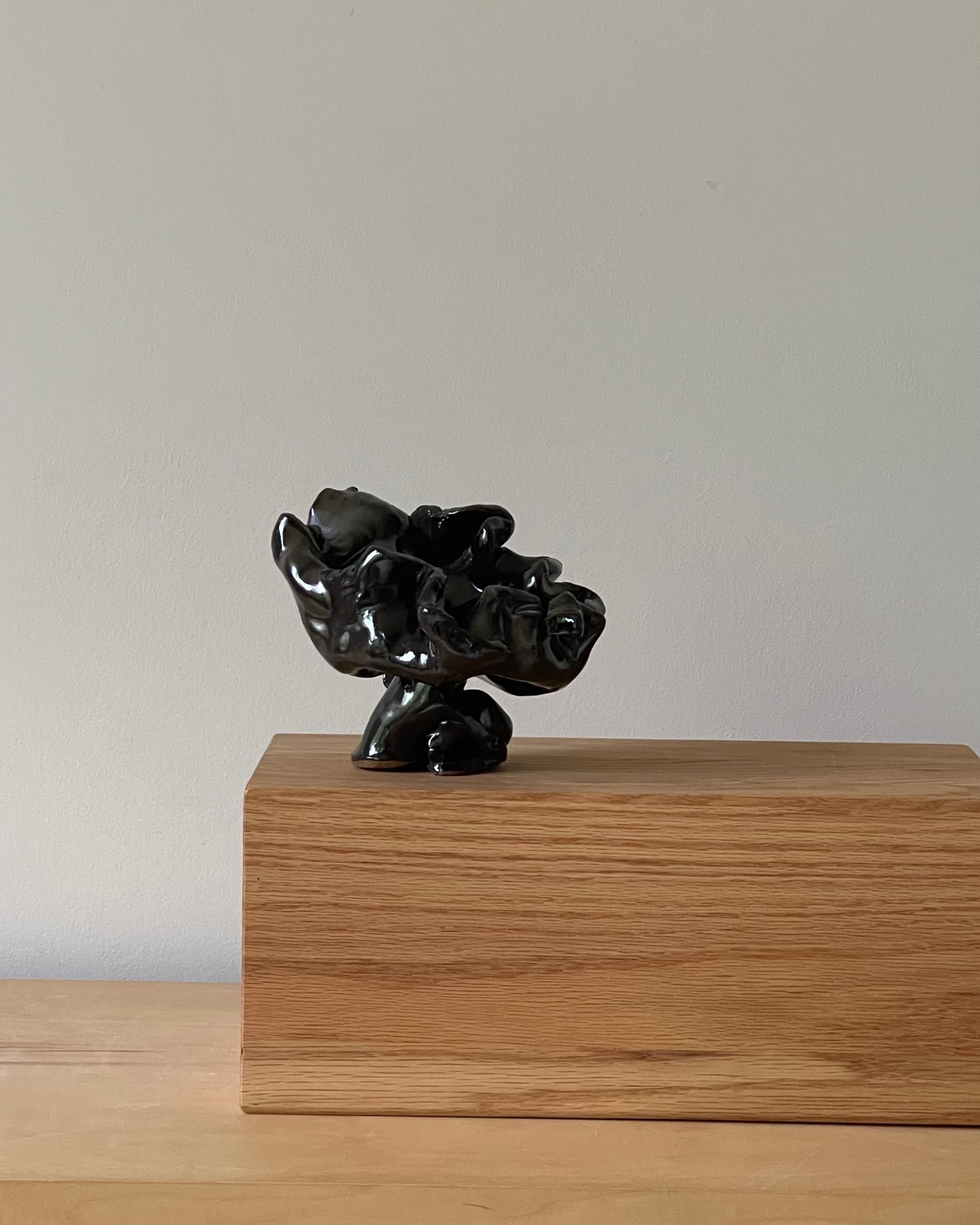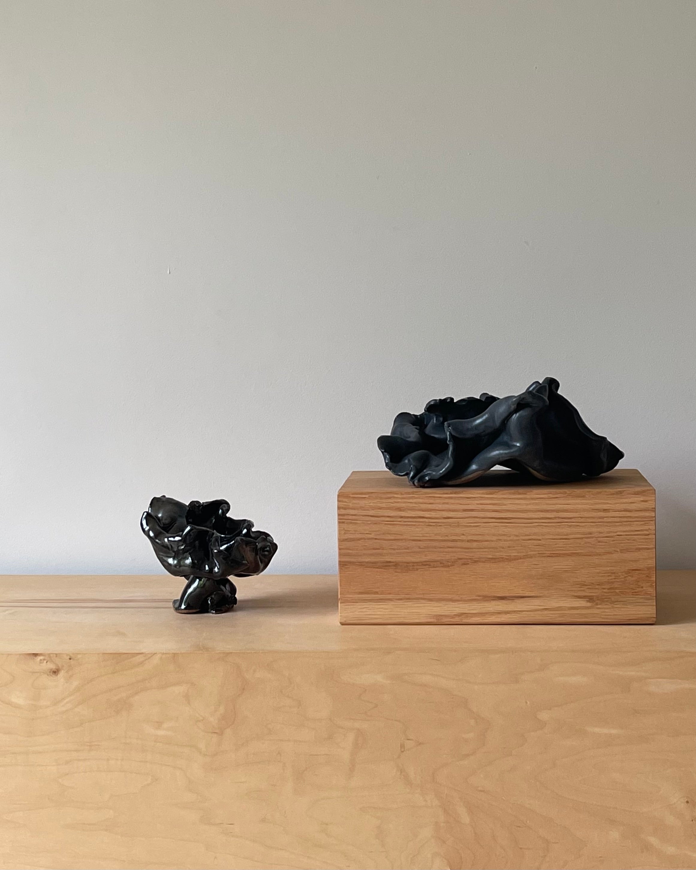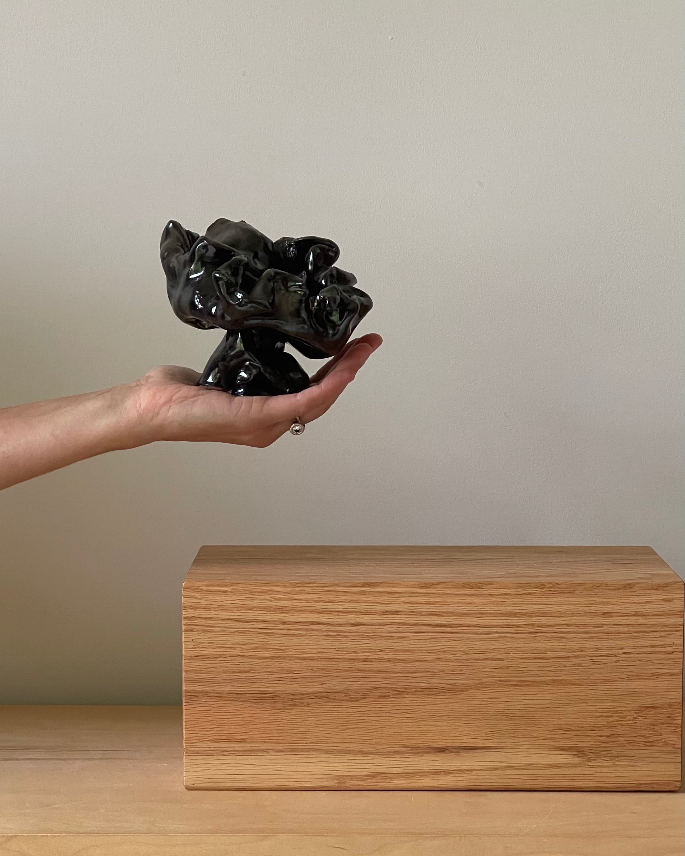 One of a kind, decorative, hand-formed bowl painted with multiple layers of black reactive glaze.